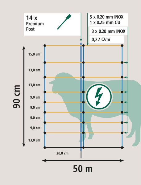 - 1 fil électrifié (haut) : 5 conducteurs inox + 1 fil cuivre pour augmenter la performance